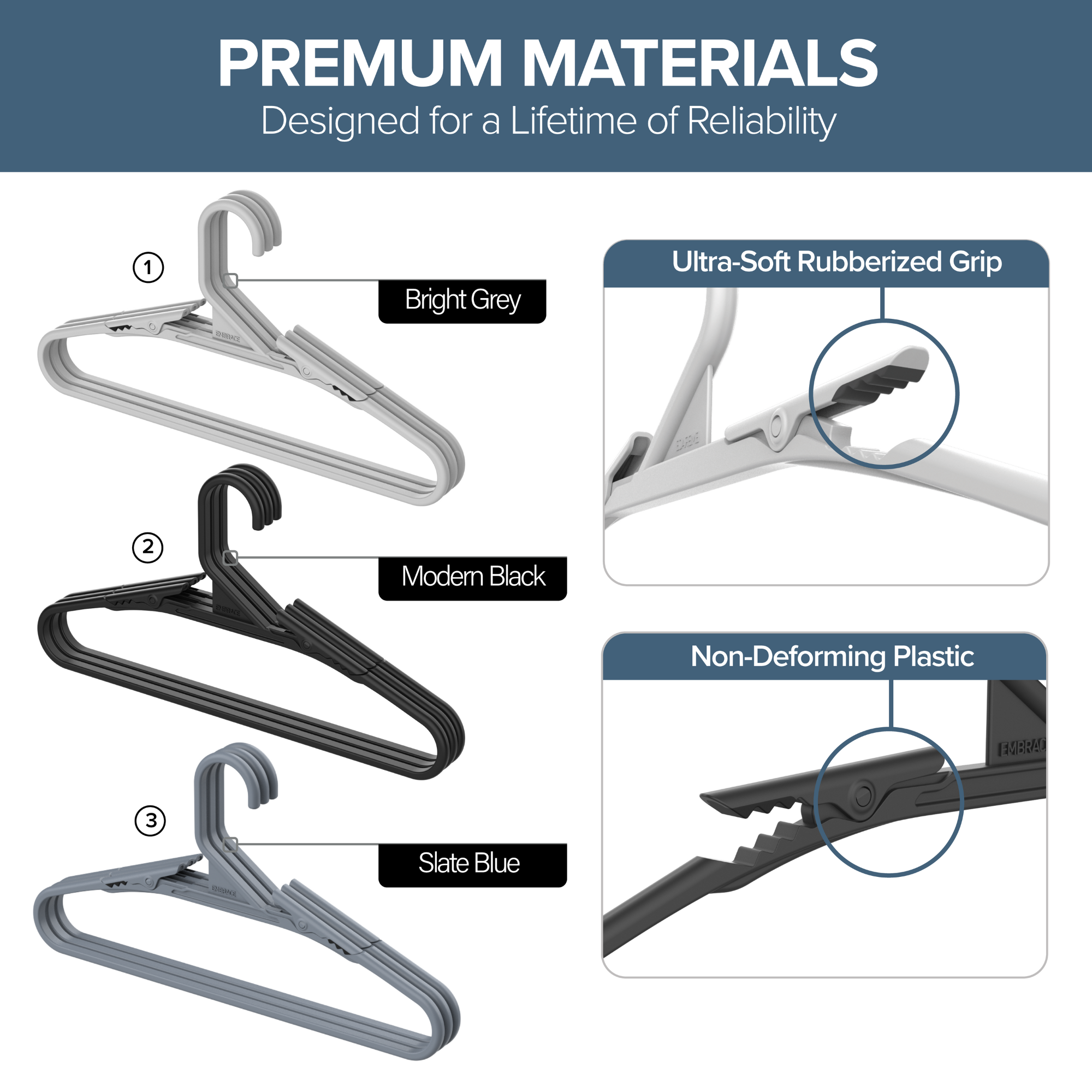 Available in Black, Grey, and Slate Blue, and in convenient 3, 6, and 10 packs, our hangers blend functionality with modern style.